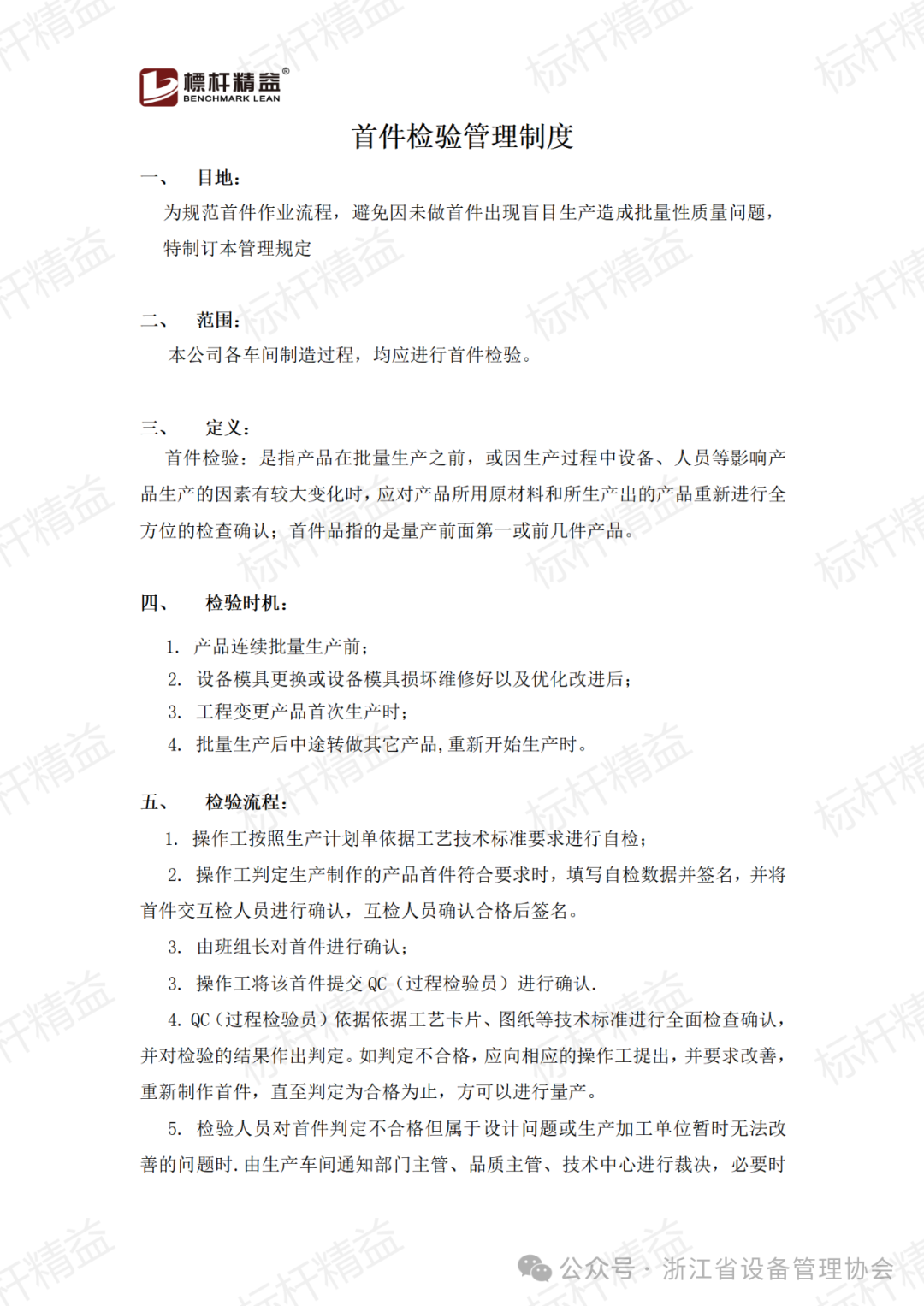 首件检验的目的生产过程中的首件检验主要是防止产品出现成批超差、返修、报废,它是预先控制产品生产过程的一种手段,是产品工序质量控制的一种重要方法,是企业确保产品质量,提高经济效益的一种行之有效、必不可少的方法。首件检验是为了尽早发现生产过程中影响产品质量的因素,预防批量性的不良或报废;首件检验合格后方可进入正式生产,主要是防止批量不合格品的出现。长期实践经验证明,首检制是一项尽早发现问题、防止产品成批报废的有效措施。通过首件检验,可以发现诸如工夹具严重磨损或安装定位错误、测量仪器精度变差、看错图纸、投料或配方错误等系统性原因存在,从而采取纠正或改进措施,以防止批次性不合格品出现。