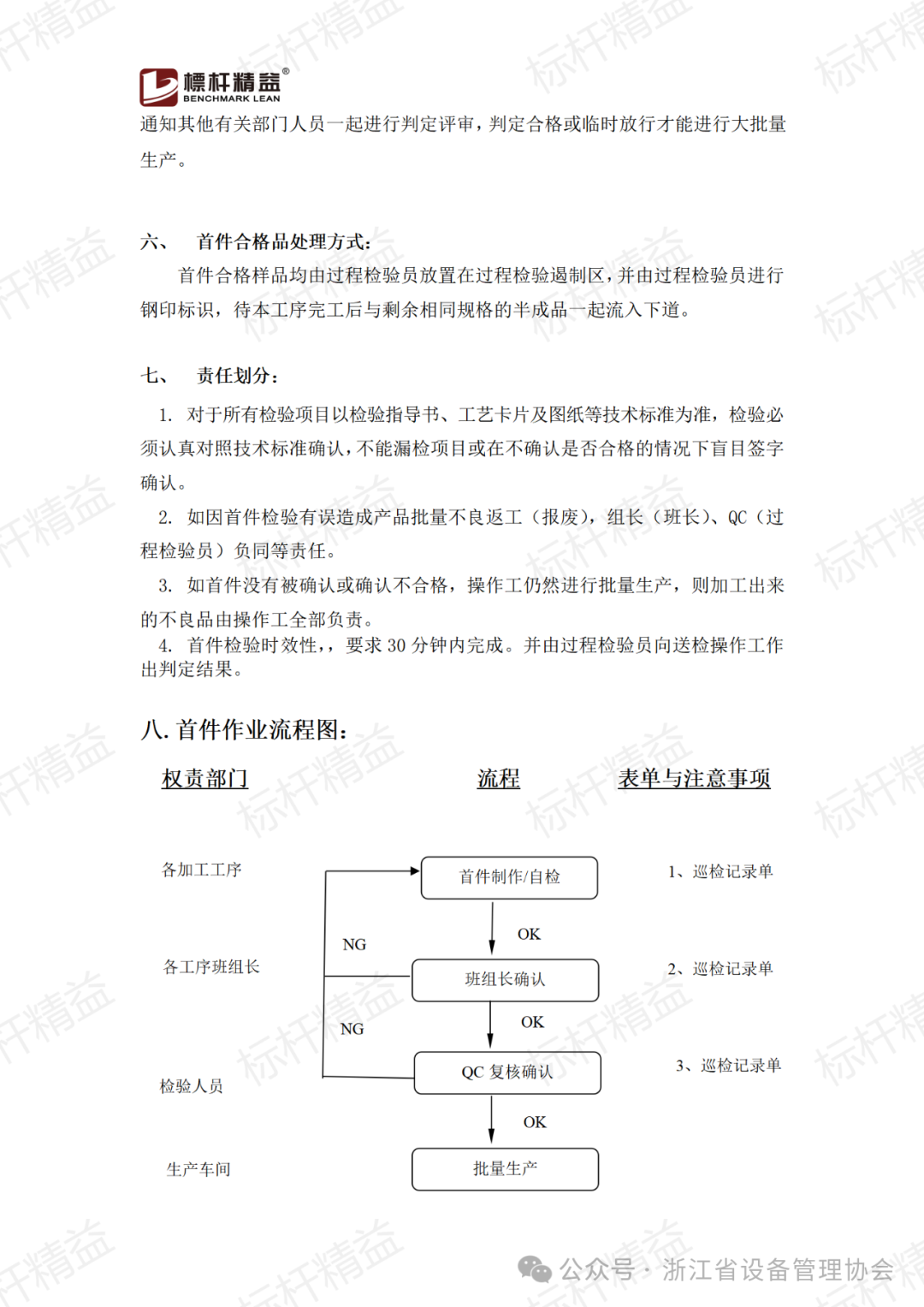 首件检验中应检查产品生产过程所用的所有原辅材料,必须与规定相符。在首件制作过程中,生产线负责人、检验人员应到生产现场监督检查实际生产者按生产工艺流程,根据现行有效的生产工艺文件自行完成首件,并对每一生产工序进行监督检查,发现问题及时予以纠正解决。常规生产产品及停机再开机生产的产品首件生产必须完成所有生产工序,经生产者检验合格在首件牌上签字后再交由检验人员等进行首件检验。首件检验时,检验员应会同生产线负责人按现行有效的图纸、清单(或顾客提供的样件)、工艺文件、产品要求进行检验,合格后在首件产品上做好标识(如签注“首件合格”等),并在首件卡上由生产者(或代表)、检验人员会签。对于因产品因较大更改所需作的首件检验可由相关人员及检验签字认可;首件检验不合格立即退回,重做首件。